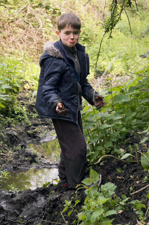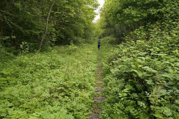 But on the other side of the road was the continuation of the embankment. Would there be any track left up there? We had to climb more fences first, and also navigate some very soft mud to find out. Unfortunately Max sunk up to his knees in the mud!
