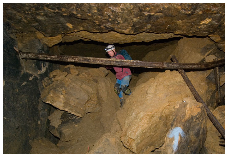 Ben points out a 'cleat' in the ceiling which were used to give an indication of movement of the rock above.