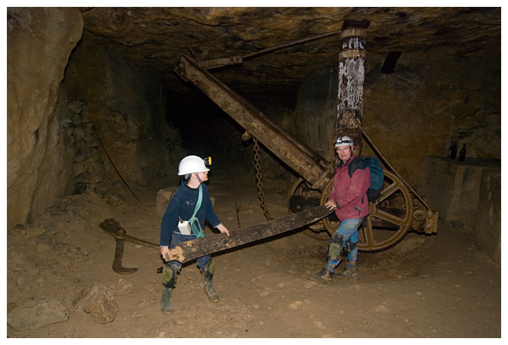 The final crane we visited. Barry and Ben hold a 'frigbob', a giant saw for cutting stone.