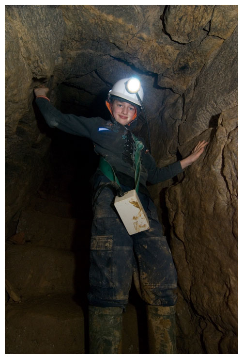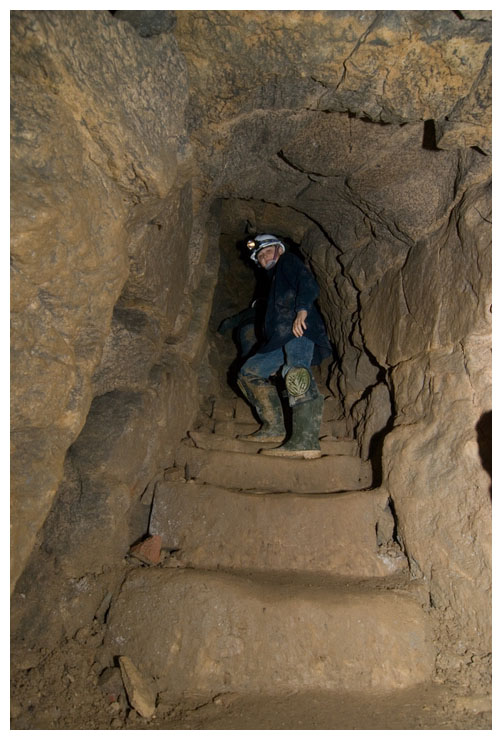 Ben and Matthew climb up the stairs that would have once led to the surface.