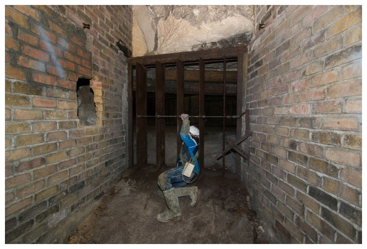 Ben squeezing through part of the old ventilation system that was used to keep the bombs dry.