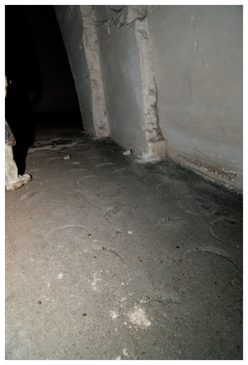The ground was covered with a special spark-proof asphalt, so that if a bomb were to be dropped it wouldn't explode. The indentations of Navy rounds can be seen in the soft surface.