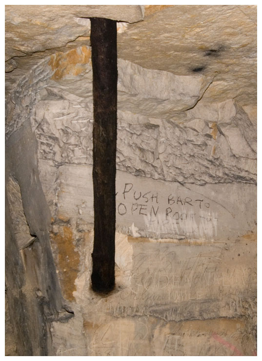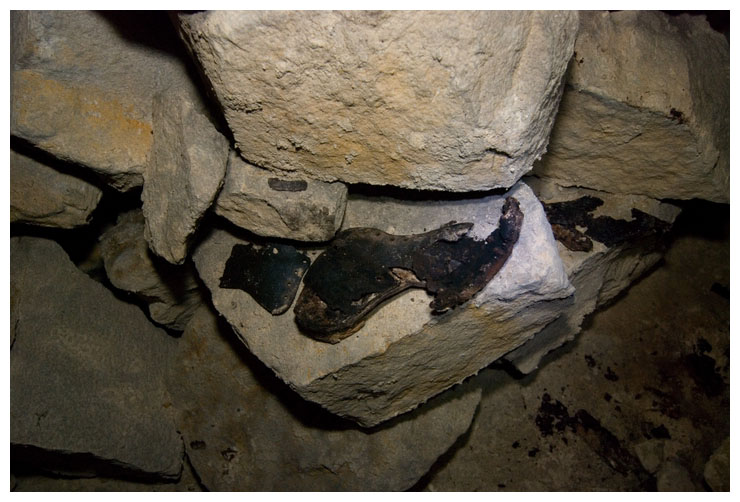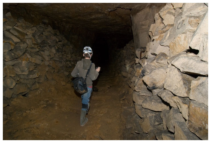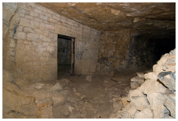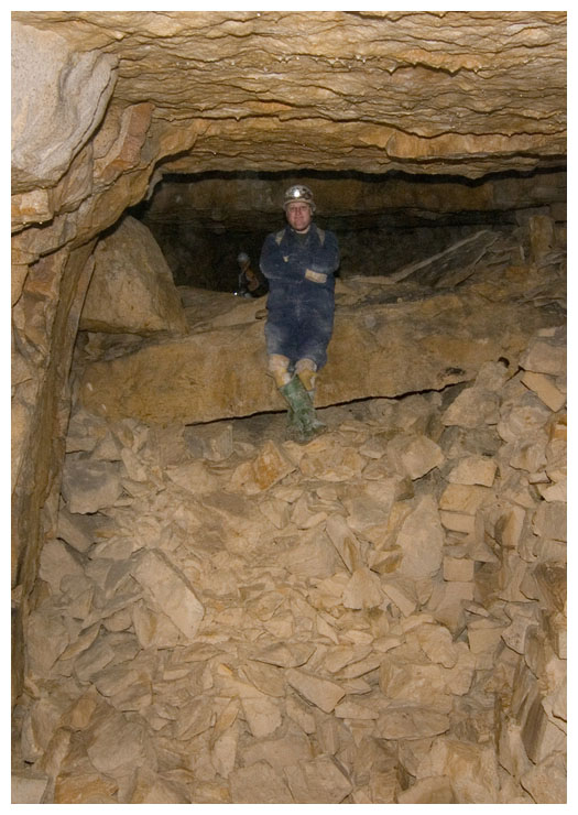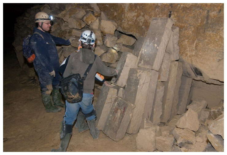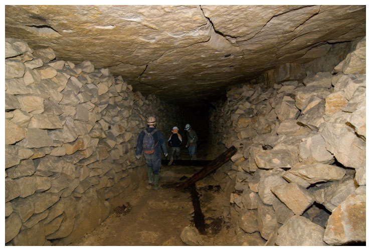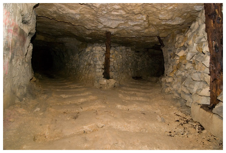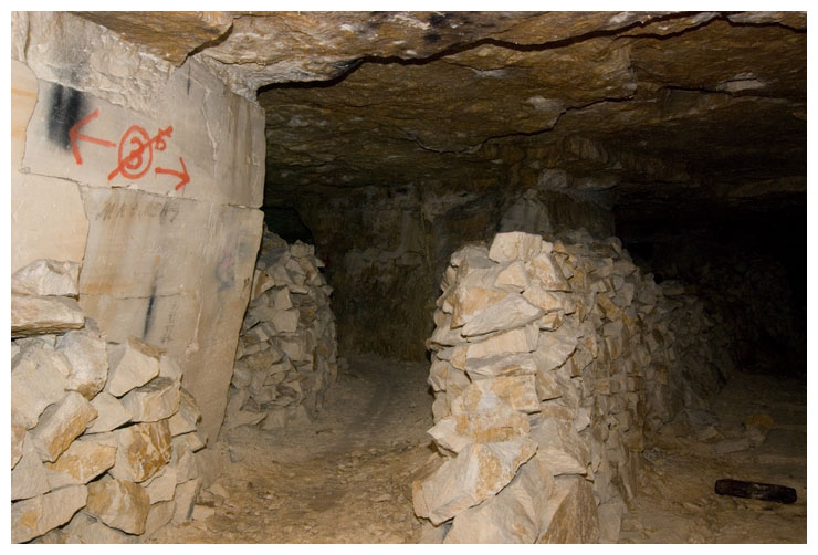 Neatly stacked cut stone, abandoned in the mine.