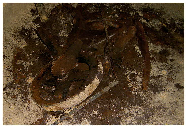 A massively decayed wooden wheel barrow.