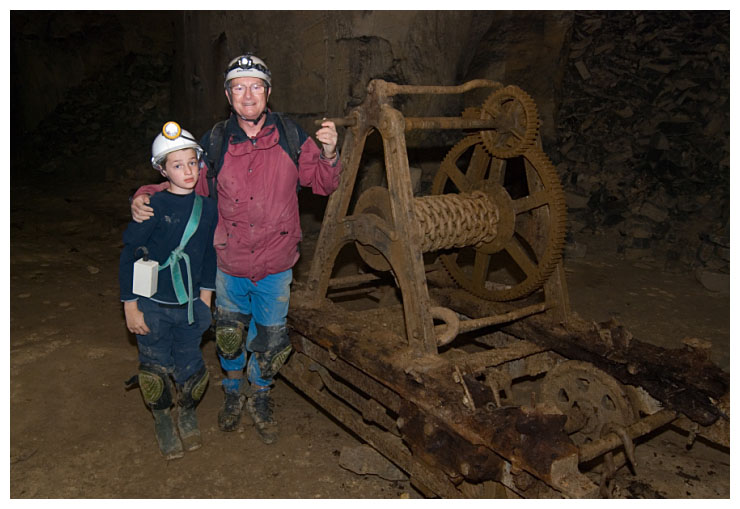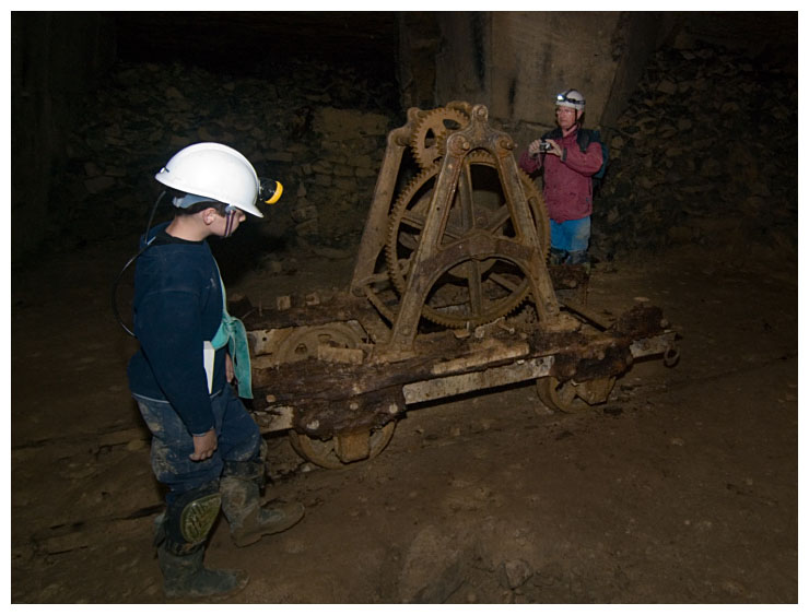 The final crane we visited. Barry and Ben hold a 'frigbob', a giant saw for cutting stone.