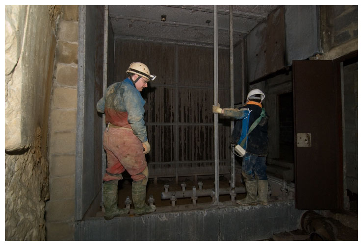 Ben squeezing through part of the old ventilation system that was used to keep the bombs dry.