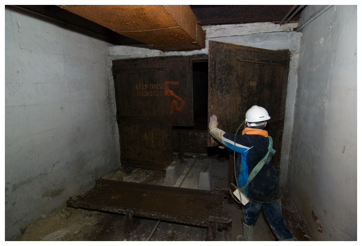 This door eventually led up to #19 District. Notice the hole in the door so that bombs on the conveyor could still pass even if the doors were shut.